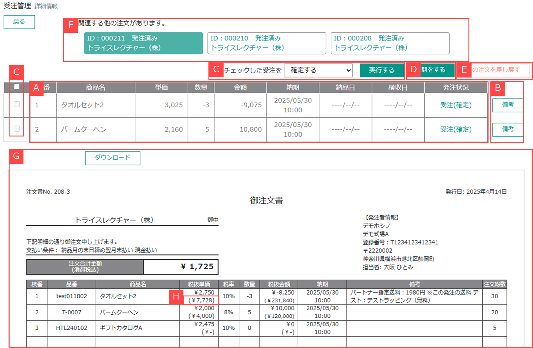 ①受注内容やステータスなどを確認できます。【A】