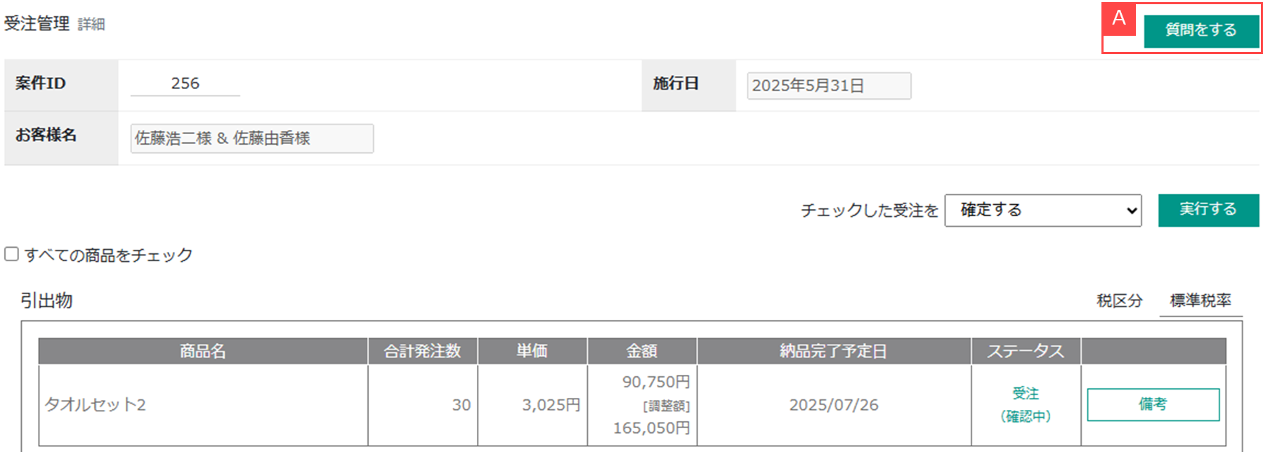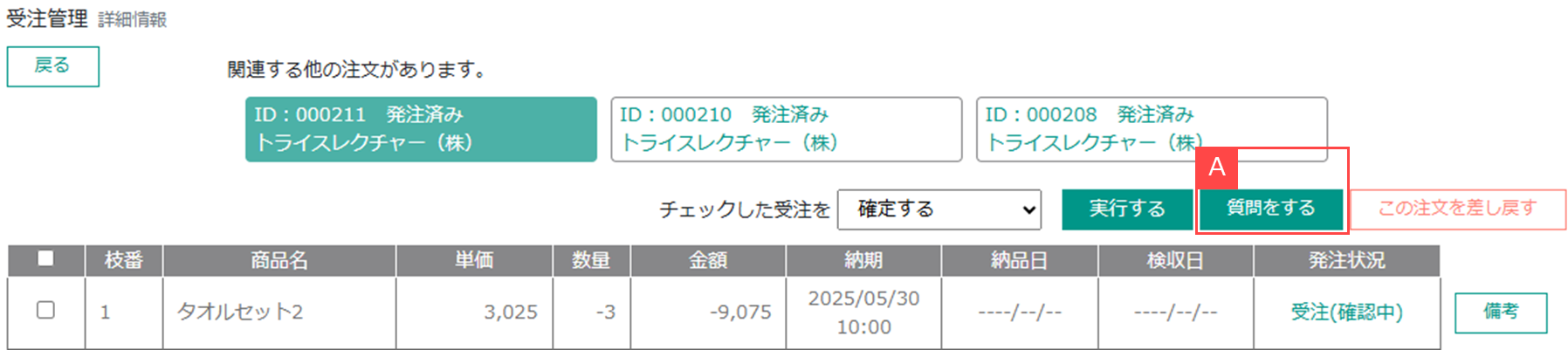 ②受注データの詳細画面を開き「質問をする」をクリックするとメッセージ送信画面が開きます。【A】