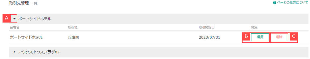 ①「▼」をクリックすると企業に紐づく式場一覧が表示されます。【A】