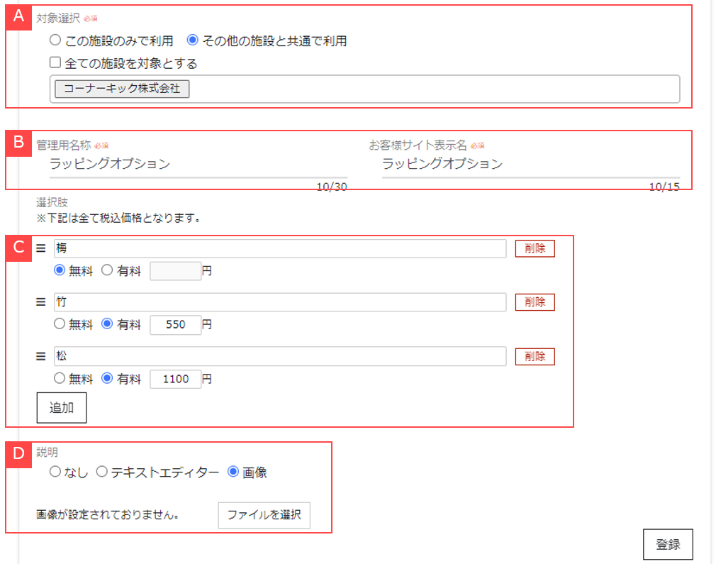 TOPメニュー > 商品管理 > オプション管理 > 送料以外のオプション新規作成 / 編集