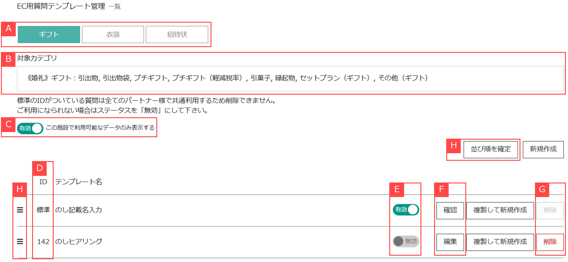 ⑥EC用質問テンプレート内容の確認 / 編集が可能です。【F】