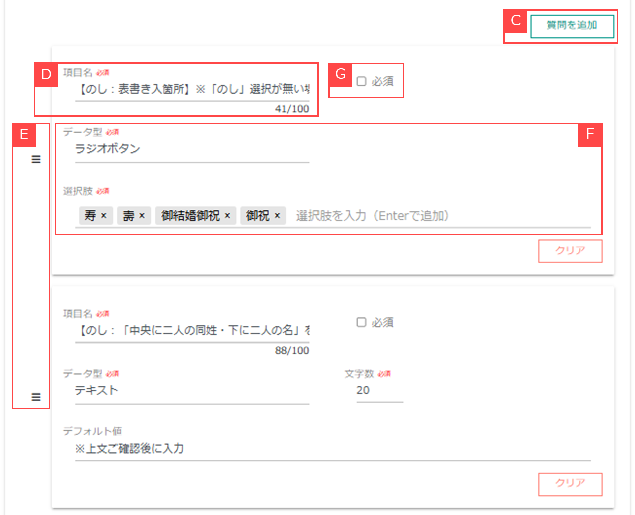 ⑤質問項目の並び順を、ドラッグ・アンド・ドロップで変更できます。【E】