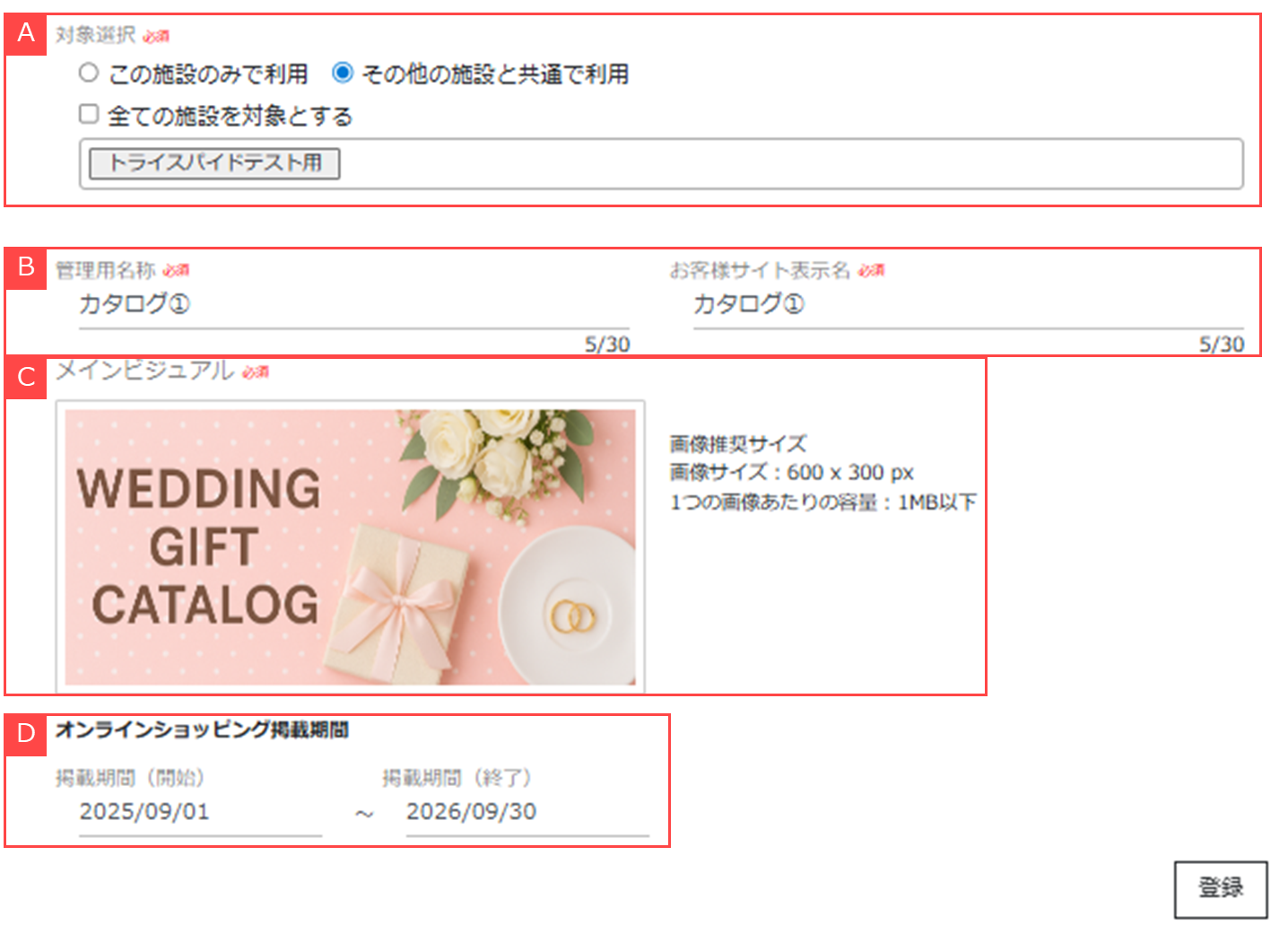 ④エンドユーザー画面に表示する掲載期間が設定可能です。【D】